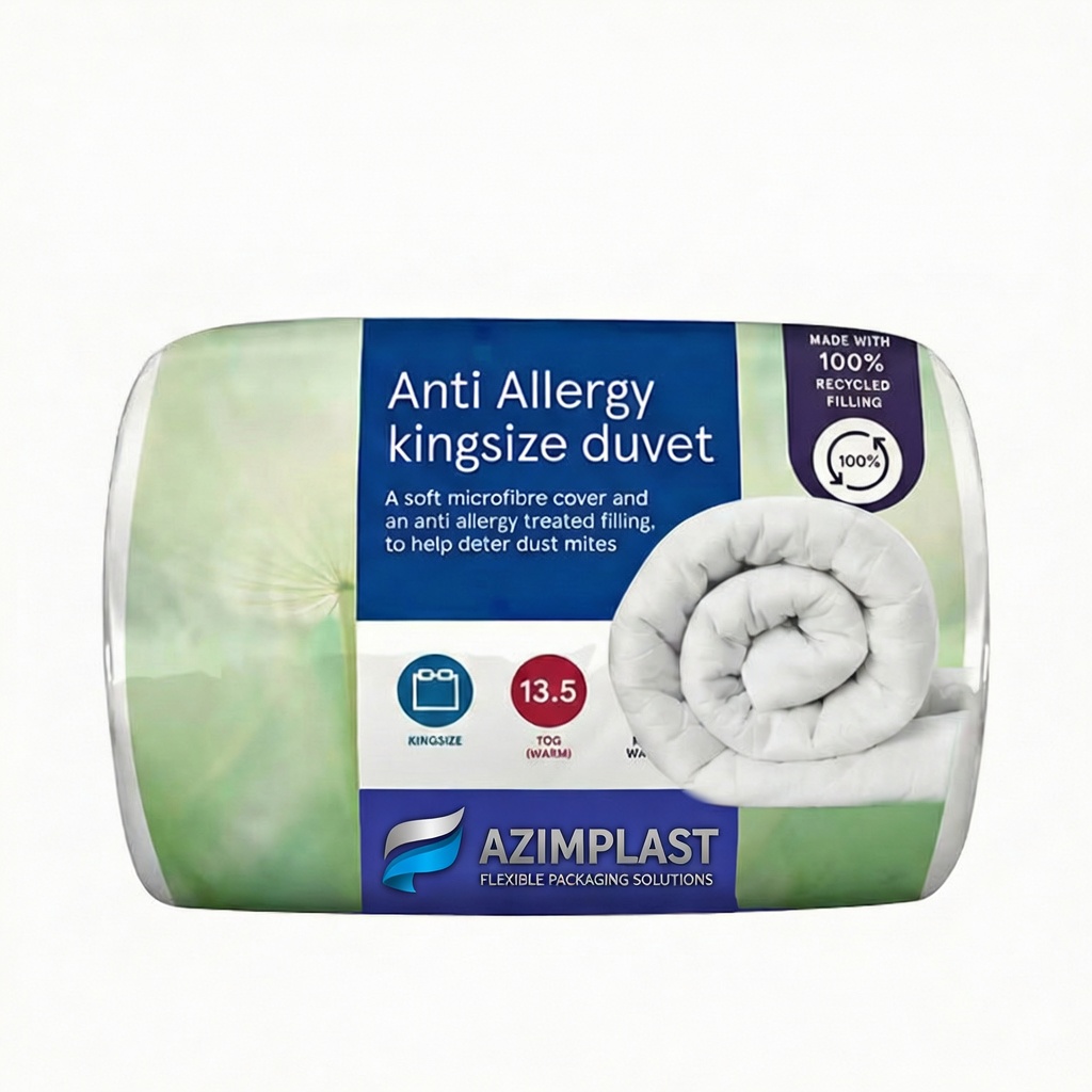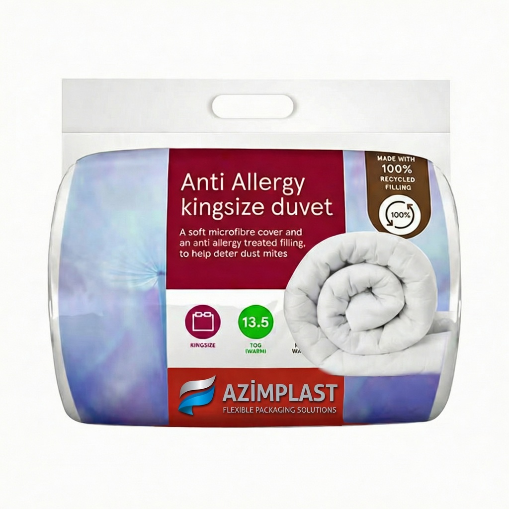 Azim Plast ev tekstili ambalajları, ileri ekstrüzyon teknolojisiyle üretilerek nevresim, battaniye, yastık ve diğer tekstil gruplarınız için en üst düzey koruma ve dayanıklılığı bir arada sunar. Güçlü yapısı sayesinde ürünleriniz, sevkiyat ve depolama süreçlerinde delinme veya yırtılma riskine karşı tam güvence altındadır.